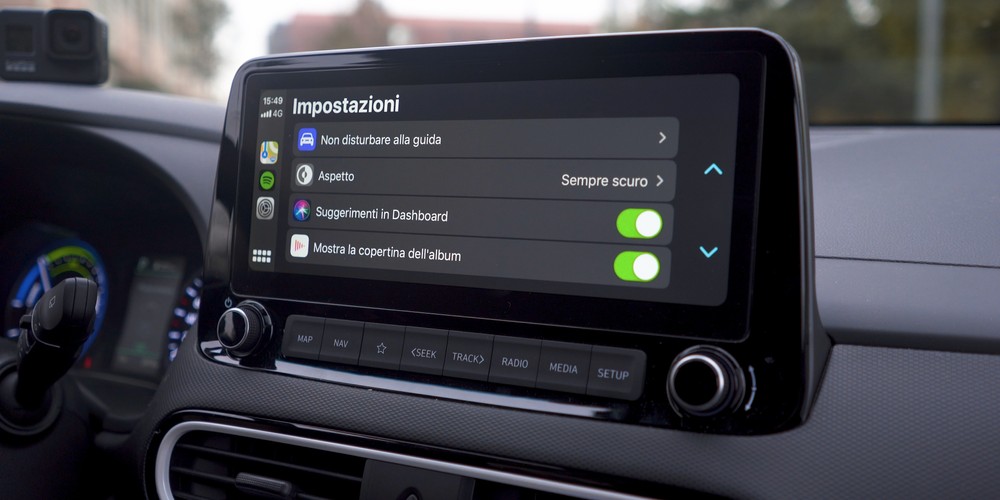 Un’altra grossa differenza tra i due sistemi è invece dato dalla modalità di accesso alle impostazioni. Su Apple CarPlay abbiamo infatti un vero e proprio menu di impostazione, piuttosto scarno a dire il vero, ma che permette di regolare i principali parametri direttamente on-board. Tra questi troviamo altre novità come la modalità non disturbare, che disattiva completamente le notifiche, o la possibilità di passare dal tema chiaro a quello scuro o di far scegliere in autonomia al sistema quale tema utilizzare in base all’orario e alla luce presente nell’abitacolo.