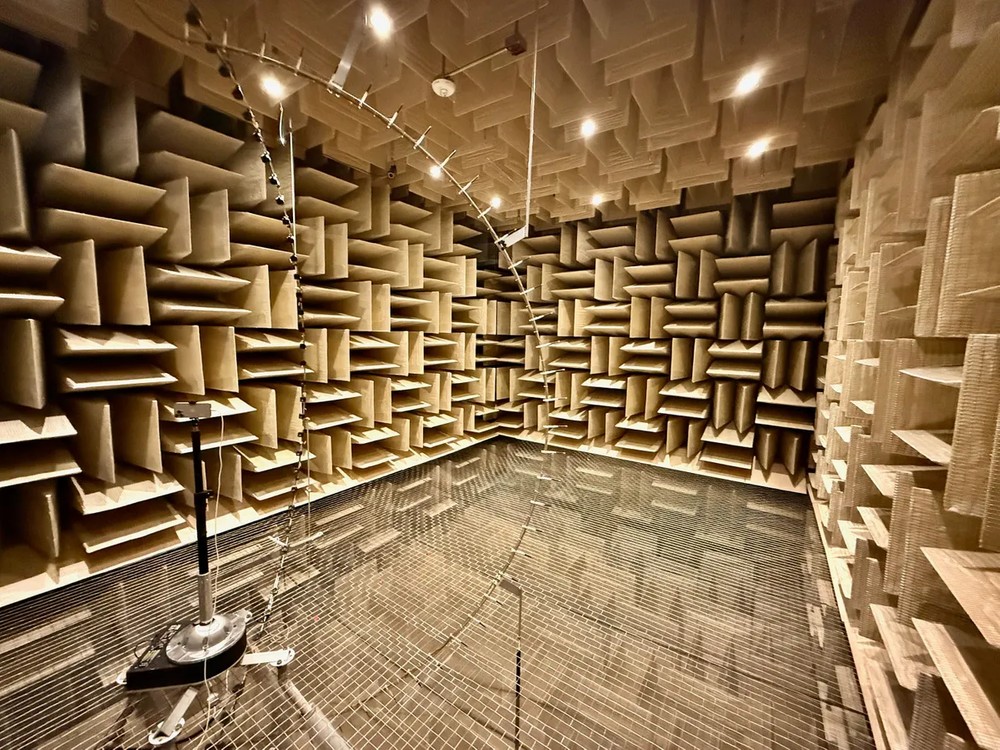 Nella camera anecoica, un iPhone 16 Pro è posto su un cavalletto al centro e ruota mentre una serie di altoparlanti (24, disposti in modo da formare un arco dal pavimento al soffitto) riproducono un suono di carillon. Nel frattempo, gli ingegneri misurano ciò che i microfoni captano. Fatto un giro completo, si ottiene un profilo sonoro sferico per ogni microfono. Apple prende questi profili e li usa come base per l’audio spaziale e altre applicazioni, incluse quelle in grado di diminuire il rumore del vento o di creare l’illusione di un audio registrato da un microfono diverso (lavalier, da studio…).