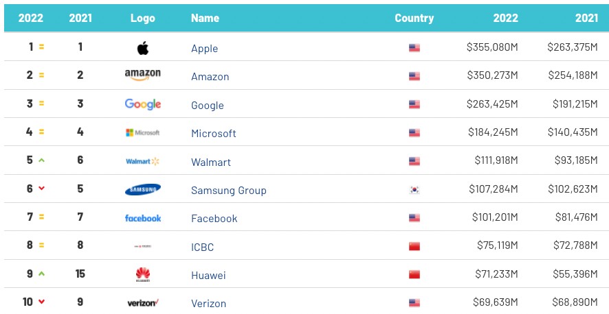 Con un incremento del 35% rispetto alla medesima indagine del 2021, Apple si riconferma il brand di maggior valore al mondo. In assoluto, cioè considerando qualsiasi categoria. Il numero è impressionante, e vale il record di sempre: la Mela, che secondo alcuni analisti si prepara a festeggiare i risultati dell’ultimo trimestre del 2021 (e dovrebbe essere, inaspettatamente, il migliore di sempre), secondo le stime di Brand Finance vale la bellezza di 355,1 miliardi di dollari.