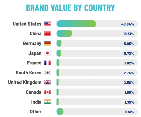 Infine una piccola nota amara: il valore cumulato dei brand italiani non rappresenta nemmeno l’1,39% del totale, la “soglia di sbarramento” per entrare nella classifica per Paese di brandirectory.com.