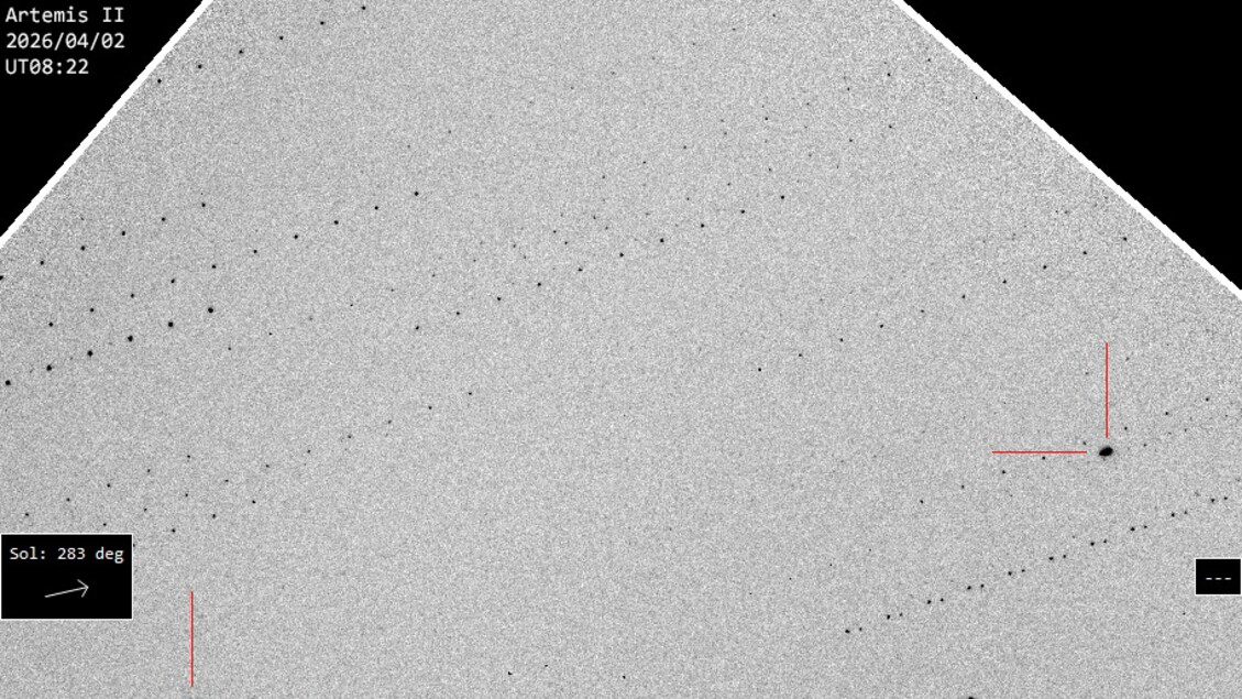 Nell’immagine sono riconoscibili due punti neri, messi in evidenza da linee rosse. Quello in basso a sinistra è la capsula Orion, a bordo della quale si trovano i quattro astronauti della missione: il comandante e veterano della Nasa Reid Wiseman, il pilota Victor Glover (primo uomo di colore a superare l’orbita terrestre), Christina Koch, prima donna a orbitare intorno alla Luna, e Jeremy Hansen dell’Agenzia spaziale canadese, primo non statunitense a spingersi così lontano nello spazio.