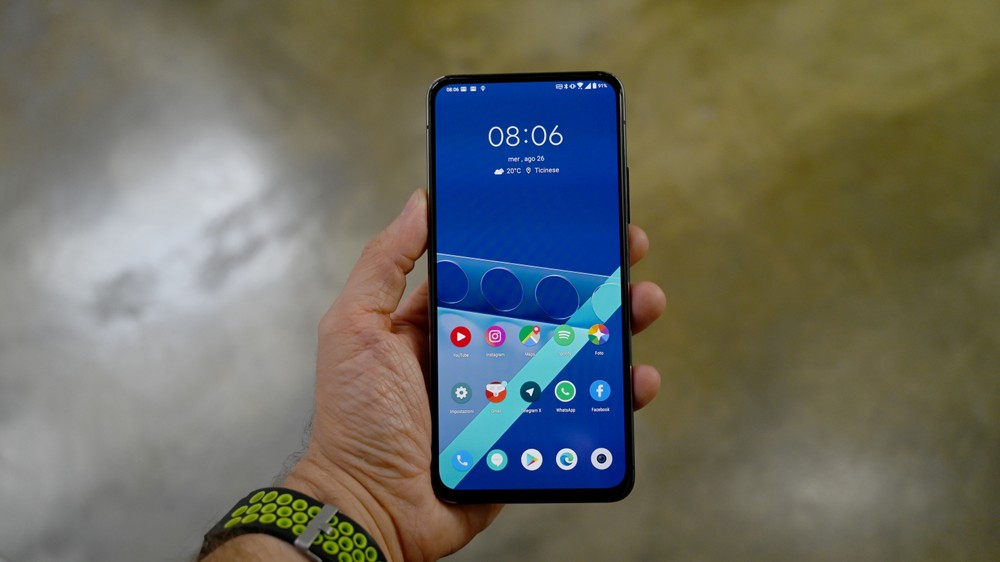 Un peso che cresce per via del display più grande, della batteria da 5000 mAh (uguale allo scorso anno ma comunque pesante), dei sistemi di stabilizzazione ottica delle fotocamere e del nuovo motorino di azionamento della Flip Camera di cui vi parlo tra poco. L’ergonomia non è il suo forte, non c’è dubbio, anche perchè la finitura lucida lo rende abbastanza scivoloso. Fortunatamente in confezione troviamo una cover che aumenta il grip in maniera sostanziale. Manca la certificazione IPxx, ma diciamo che rendere impermeabile il modulo delle fotocamere con il suo movimento è un’impresa quasi impossibile.