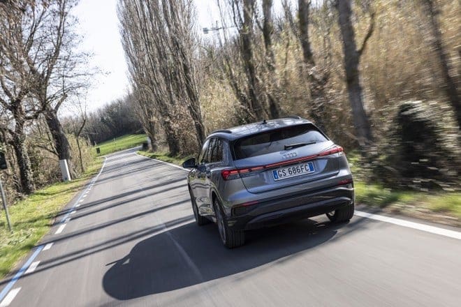 L’altro aggiornamento che noto, oltre al fatto che le versioni quattro raggiungono i 175 kW per la ricarica in DC (purtroppo la 45 e-tron resta ferma a 135 kW), è quello del setup: già prima era piacevole, ma ora incontra maggiormente il gusto di chi apprezza una taratura più sostenuta, anche se ormai il gruppo Volkswagen (e Audi in particolare) è davvero riuscito a rendere la guida dei SUV molto più vicina alle sensazioni delle auto a ruota bassa. E con Q4 questo accade anche sulla versione d’ingresso.