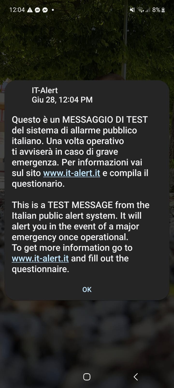 This is a TEST MESSAGE from the italian public alert system. It will alert you in the event of a major emergency once operation. To get more information go to www.it-alert.it and fill out the questionnaire.
