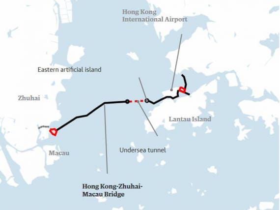 Record e più record. A circa tre quarti dalla partenza si è resa necessaria la costruzione di un tunnel sommerso lungo 6,7 chilometri, perché il delta del Fiume delle Perle è una delle aree più trafficate al mondo: in quell’area circolano quotidianamente 4.000 navi di ogni genere, dai traghetti passeggeri alle gigantesche porta-container, ed era necessario lasciare loro un passaggio.