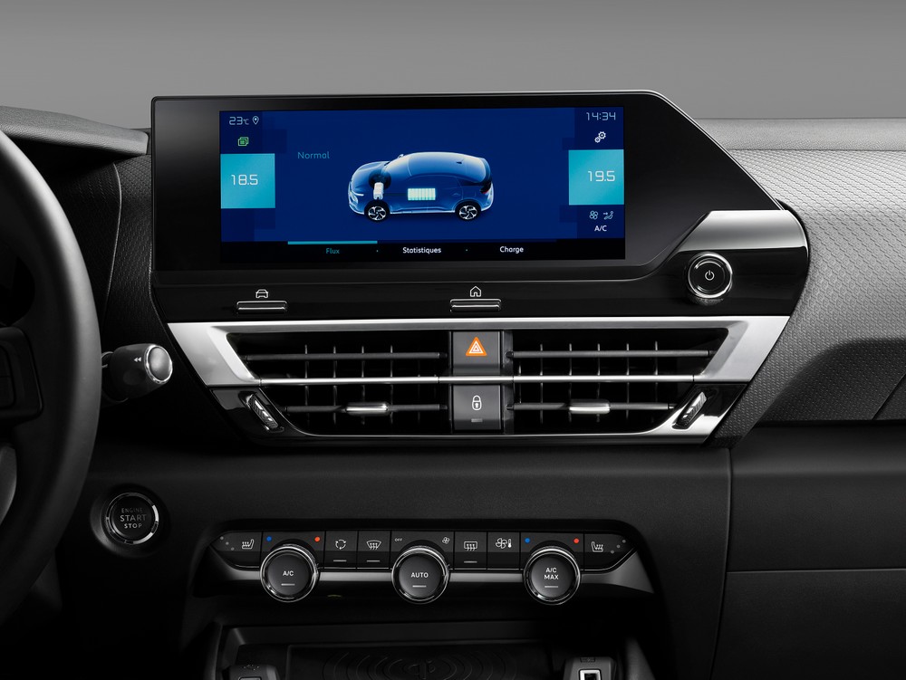 C4 elettrica propone interni sobri e tecnologici, a metà tra presente e futuro. In alto troneggia il display dell’infotainment touch da 10″ ma resta il climatizzatore (bizona) con comandi di tipo tradizionale, facendo tesoro della lezione imparata con le nuove DS ad esempio. Il tunnel centrale è molto pulito grazie al “by-wire” che crea tantissimo spazio per gli oggetti.