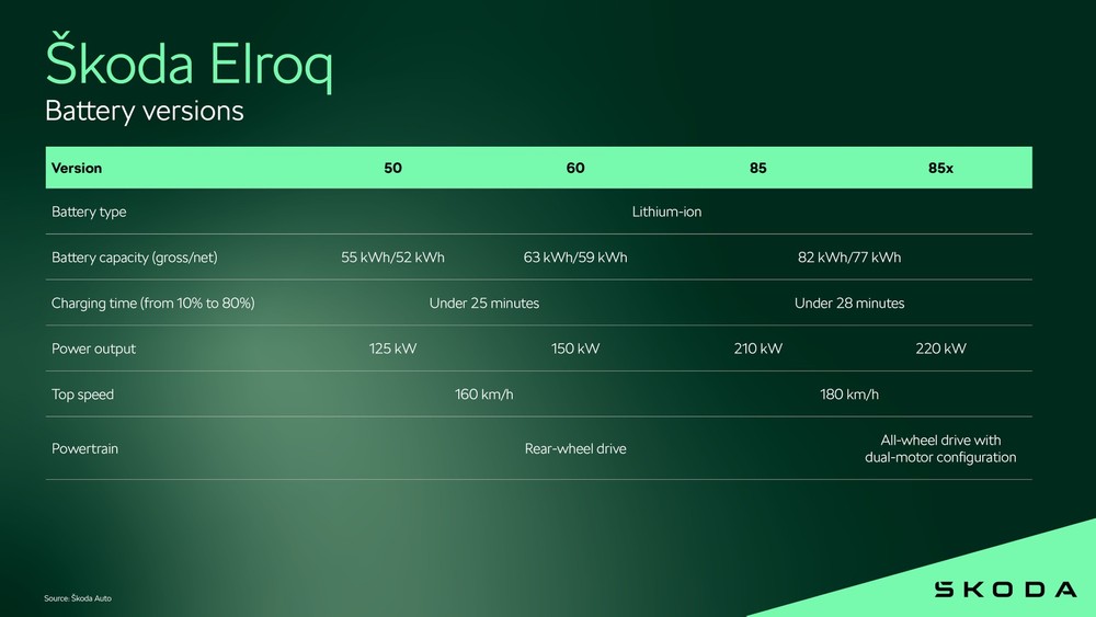 Nuova Skoda Elroq sarà proposta nelle varianti 50, 60, 85 e 85x. Entrando nello specifico, Elroq 50 disporrà della trazione posteriore e di una batteria da 55 kWh che alimentata un motore elettrico da 125 kW. Elroq 60 ha una batteria da 63 kWh e un motore elettrico da 150 kW.