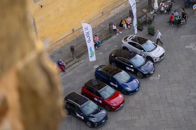 A colpi di ricariche fast, una a colazione e una a pranzo, talvolta in zone isolate e poco servite, si arriva così a Siena dove la cornice di Piazza del Campo accoglie pian piano le varie elettriche del tour.