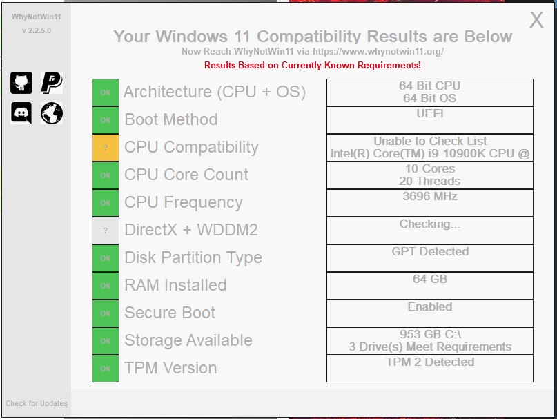 In alternativa potete scaricare (è sicuro) un programmino open source ideato da uno sviluppatore indipendente, il nome è esplicativo: WhyNotWindows11, si può scaricare da QUI e vi dice dettagliatamente quali requisiti sono soddisfatti e quali no.