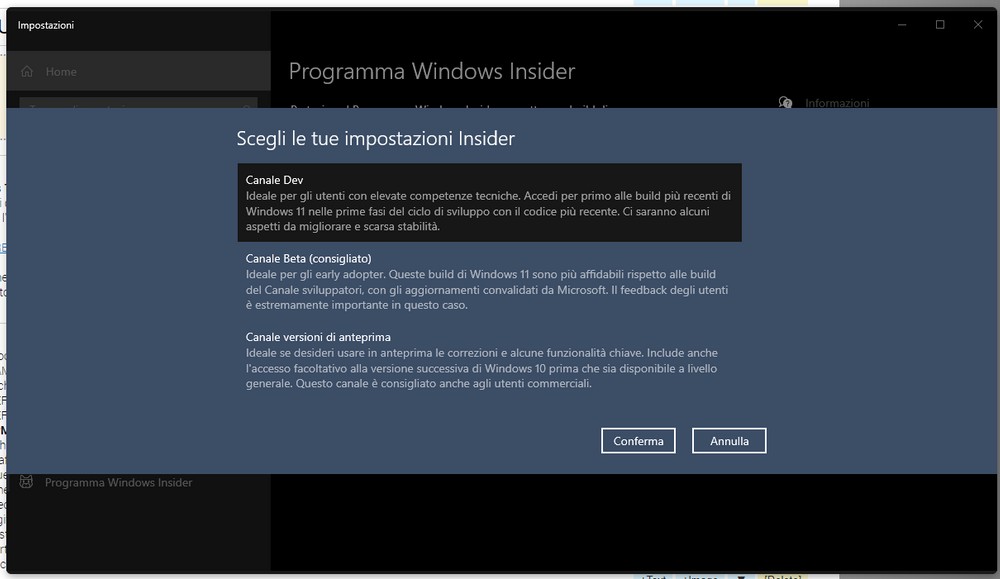 Tornando sulla scheda Windows Insider avrete ora l’opportunità di registrarvi collegando l’account Microsoft e scegliere il canale a cui aderire (si può sempre cambiare). Una volta terminata la procedura basterà riavviare il PC e gli aggiornamenti in anteprima arriveranno attraverso Windows Update come se fossero normali update.