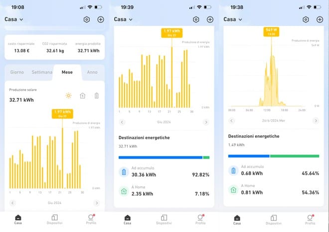 L’eccesso di produzione viene dirottato nelle batterie se quanto sopra accade di giorno. Di notte, invece, il sistema attinge dalle batterie fino al livello minimo (10% di carica residua). In alternativa, per chi conosce già il proprio consumo base dato ad esempio da router e domotica, tramite app si può impostare facilmente un’erogazione costante in grado di coprirlo completamente o in parte, a seconda della strategia che impostiamo.