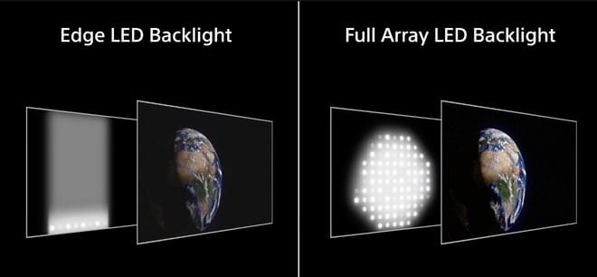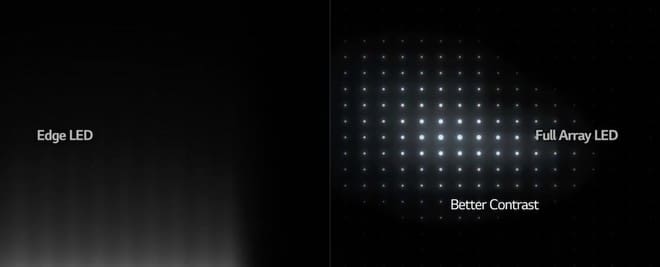 La tecnologia Full LED Array con local dimming nasce per cercare di superare quello che è sicuramente il più grande limite degli LCD: il livello del nero. Per riprodurre il nero i cristalli liquidi vengono impiegati in sinergia con i polarizzatori per bloccare la luce proveniente dalla retroilluminazione. Per spiegarlo in termini molto semplici si può immaginare il tutto come una sorta di otturatore che entra in funzione quando si deve rappresentare la totale assenza di luce. L’obiettivo non è però alla portata degli LCD poiché, a meno di non spegnere completamente la retroilluminazione (si può fare solo su schermate totalmente nere), una certa quantità di luce passa comunque. Lo si può notare a occhio nudo guardando lo schermo in ambienti oscurati: senza l’ausilio di tecnologie aggiuntive il nero assoluto non si può ottenere su un TV LCD.