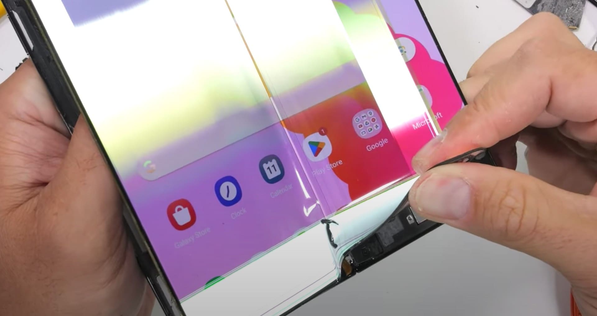 Dal video si osserva come l’accesso all’interno di Galaxy Z Fold 5 effettuato dalla parte anteriore porti alla rottura dei pixel del display interno. Altro discorso è invece l’apertura “classica” dal lato posteriore, decisamente più semplice e meno “distruttiva” nel caso in cui sia necessario sostituire ad esempio la batteria. Desta curiosità il sottile strato di schiuma dotato di piccoli tagli circolari: potrebbe trattarsi di quello shock dispersion layer di cui Samsung ha parlato in occasione della presentazione dello smartphone, integrato per rendere il dispositivo più resistente alle cadute.