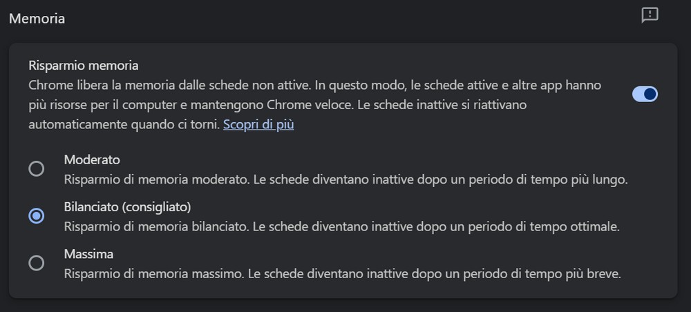 È possibile selezionare la modalità di risparmio memoria preferita dal menù Impostazioni di Chrome, sotto l’opzione Prestazioni.
