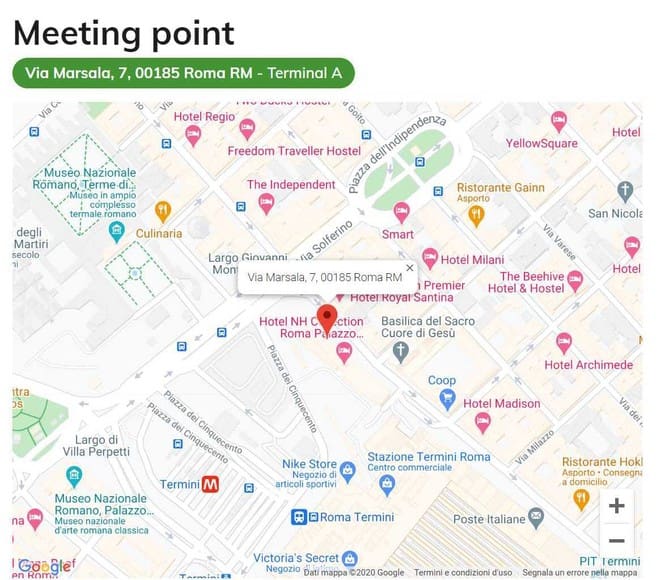 Tutti i Tour avranno partenza e arrivo nella stessa location ed in particolare vi aspettiamo, agli orari in cui vi iscriverete, in Via Marsala, 7, 00185 Roma RM – Terminal A come da mappa a seguire:
