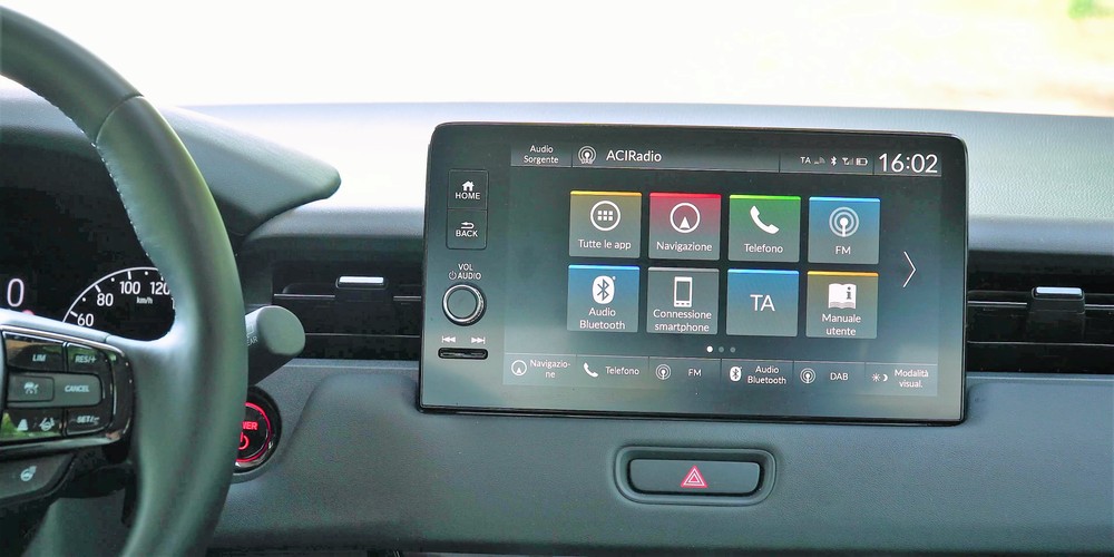 Il sistema multimediale dell’HR-V è semplice ma funziona bene. Il display centrale da 9” vanta una grafica chiara, ma non particolarmente elaborata, con icone grandi e colorate. È piuttosto reattivo, solo il navigatore a volte rallenta un po’. In basso ci sono tasti a sfioramento per spostarsi da un sottomenù all’altro, e si può tornare alla “home” in un attimo con il comodo tasto fisico alla sinistra del display. Il sistema è compatibile con Apple CarPlay, anche wireless, e Android Auto.