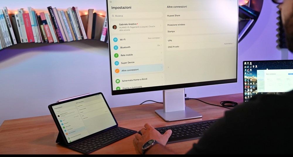 La connessione al notebook funziona via cavo ma potete anche decidere di proiettare lo schermo wireless con l’apposita funzione di Windows. Allo stesso modo potete collegare anche il tablet, nel nostro caso un MatePad 11. Connesso via Wireless al monitor l’interfaccia del tablet verrà riprodotta sullo schermo e potrete interagire con il sistema utilizzando sempre i soliti mouse e tastiera collegati direttamene al display.