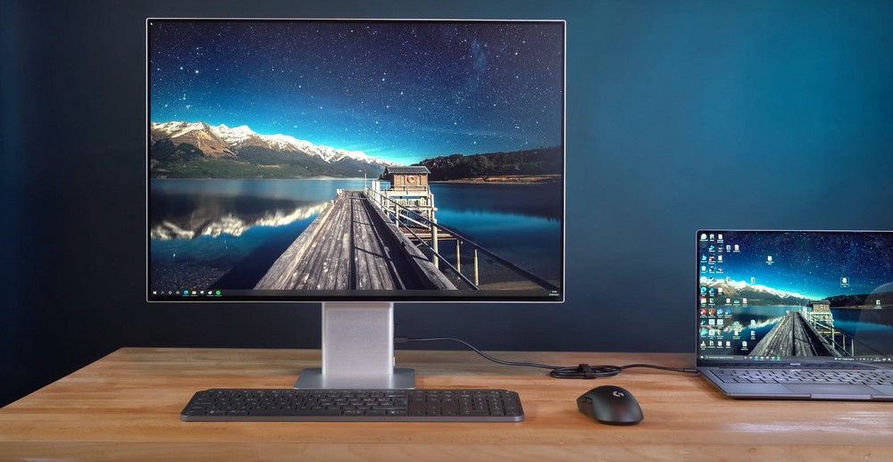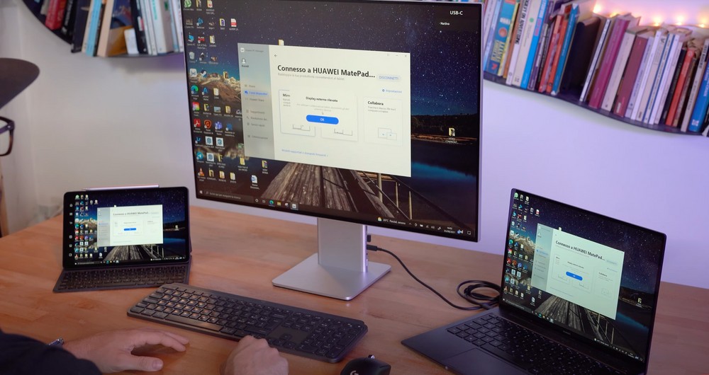 Comincio parlandovi della connessione al notebook, nel nostro caso un MateBook 14 del 2020. Nulla di più semplice e classico, basta collegare il notebook al display tramite una USB-C e decidere se duplicare l’immagine, estendere il desktop oppure se utilizzare solo il secondo schermo e quindi spegnere quello del portatile. La particolarità, come già detto in precedenza, è il fatto che mouse e tastiera sono collegati direttamente al display ma controllano il notebook come se fossero collegati direttamente ad esso, senza il minimo ritardo.