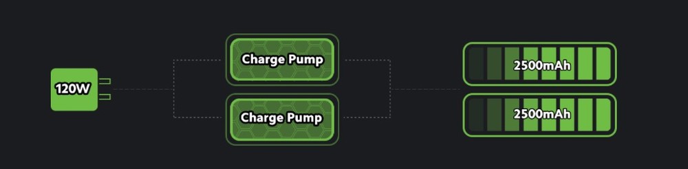 Come anticipato, il caricatore alimenta una batteria da 5.000 mAh che è però suddivisa in due celle da 2.500 mAh ciascuna. Nel processo di carica, il flusso di energia viene immesso nelle celle per mezzo di quattro accessi da 30 W, permettendo dunque di ricaricare parallelamente a 60 W le due coppie di celle (così da raggiungere i 120 W complessivi). Questo doppio flusso abbassa la tensione e aumenta l’amperaggio oltre gli standard, garantendo un maggior assorbimento di potenza.