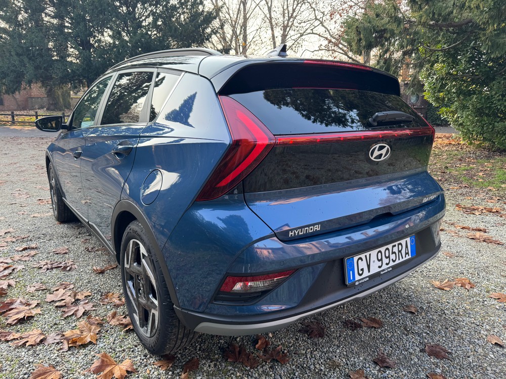 I cerchi in lega da 17 pollici, di serie su questa versione XClass, l’altezza da terra di 16 cm, i passaruota in plastica nera a contrasto e i particolari satinati nella parte bassa dei paraurti, le conferiscono un aspetto da piccola fuoristrada, anche se la Bayon preferisce decisamente l’ambito urbano. Si tratta di un’auto dal design divisivo: o si ama o si odia, nessuna via di mezzo. Una scelta coraggiosa, che rende questa Hyundai diversa rispetto la concorrenza.