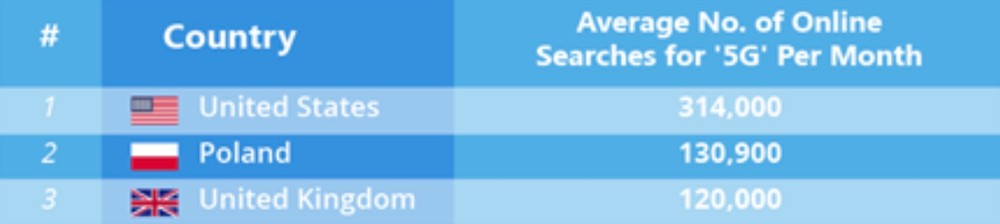 Non tutte le ricerche sul 5G riguardano le domande citate in apertura, c’è chi semplicemente vuole approfondire l’argomento senza preconcetti. Gli Stati Uniti sono il Paese in cui si concentrano la maggior parte delle ricerche mensili con la keyword “5G”, seguono la Polonia (130.900) e il Regno Unito (120.000). I Paesi meno interessati all’argomento sono invece la Nuova Zelanda (8.650), il Belgio (13.200) e la Danimarca (13.500).