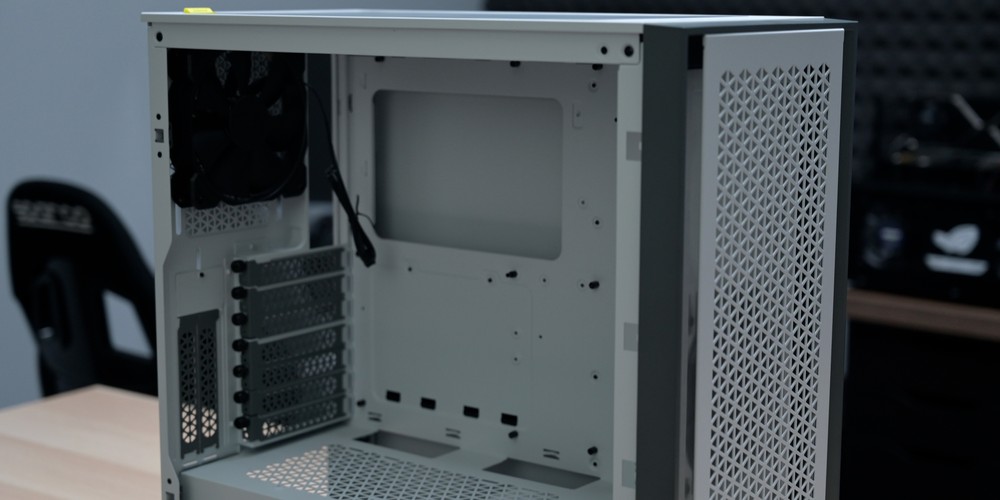 Parto a raccontarvi la nostra nuova build proprio dal case: un Corsair 4000D Airflow in colorazione bianca con pannello frontale traforato e laterale in vetro temperato. Parliamo di un case ATX mid-tower comunque generoso in termini di spazio all’interno delle paratie e a disposizione dell’utente, sia per l’inserimento dei componenti sia per un agevole cable-management. Spazio che permette di alloggiare in questo cabinet anche schede video di grandi dimensioni, fino ad una RTX 3090 di ultima generazione.