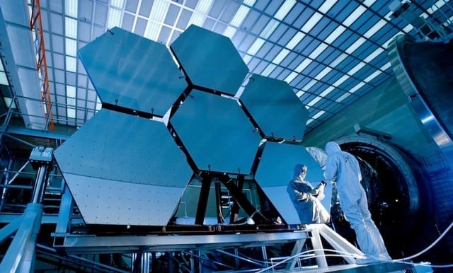 Effettivamente è anche abbastanza scenico, formato da diciotto esagoni rivestiti da una sottilissima lamina d’oro per poter riflettere al meglio l’infrarosso. Il corpo centrale dello specchio è composto da 12 esagoni, mentre altri sei (tre per lato) sono ripiegati in modo da occupare meno spazio e si apriranno una volta in orbita. Di fronte a questi c’è uno specchio secondario che raccoglie la luce proveniente dagli esagoni, anch’esso viaggia ripiegato e si aprirà grazie ad alcuni lunghi supporti che lo faranno rimanere sospeso davanti allo specchio principale a una distanza di 7,4 metri.