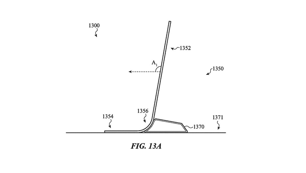 Le ipotesi mostrate nella documentazione – disegni inclusi – sono diverse, anche se tutte partono dalla stessa struttura iniziale. Cambia la forma del modulo chiamato a sorreggere il computer, così come vengono ipotizzate diverse soluzioni per il vetro: un pezzo unico, due pezzi che possono essere ripiegati su se stessi per facilitarne il trasporto, una tastiera integrata, uno spazio vuoto per inserire una tastiera esterna o addirittura incastrare un MacBook dal retro. E parte dei componenti interni potrebbe essere posizionata all’interno del supporto stesso, porte incluse.