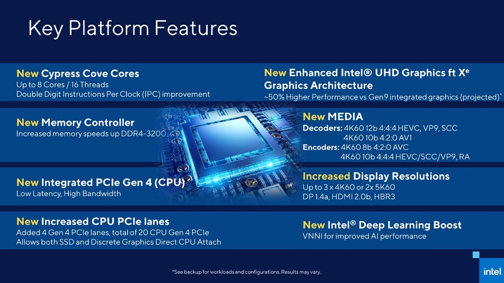 Nel documento messo a disposizione da Intel troviamo tutti i punti chiave della nuova piattaforma, senza però particolari approfondimenti che, verosimilmente, arriveranno a ridosso della presentazione ufficiale. Come già discusso nelle scorse settimane, Intel sembra essere riuscita a incrementare nettamente l’IPC delle nuove CPU grazie all’architettura Cypress Cove che, stando a quanto emerge dalle slide, offrirà un netto miglioramento rispetto alle attuali soluzioni (si parla di una percentuale a doppia cifra).