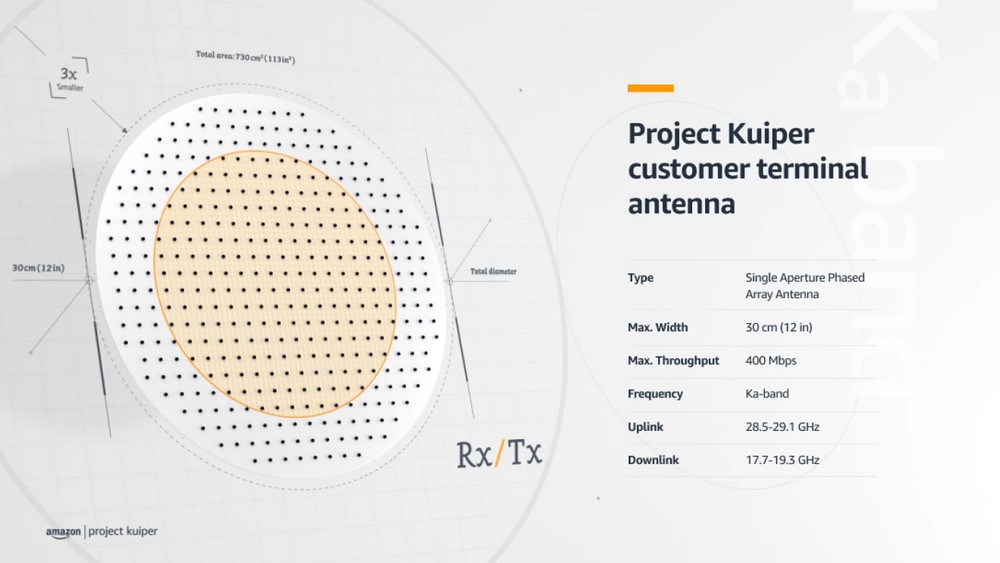 Già certificato FCC – conditio sine qua non per poter operare – il progetto è ora nel clou del suo sviluppo: Amazon ha mostrato infatti l’antenna che sarà messa a disposizione dei clienti, dispositivo fondamentale – come facile intuire – affinché il segnale venga recepito nel modo migliore possibile. Si tratta di un’antenna phased array a banda Ka (con frequenze tra 27 e 40GHz) basata su un’architettura di nuova concezione in grado di fornire velocità elevate di trasmissione e bassa latenza.