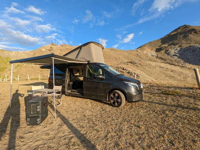 Il nostro esemplare, oltre all’allestimento camper (area living con tavolino, sedili anteriori girevoli, riscaldamento a gasolio autonomo ad aria, sedili posteriori trasformabili in letto, tetto apribile a soffietto con letto, angolo cottura, frigobox da 40 litri, vari vani di stoccaggio, guardaroba, connessioni esterne per elettricità e acqua, batteria supplementare per utenze), aveva poi una serie di sciccherie tra cui attivazione del tetto a soffietto elettrica, tenda parasole, gancio traino, sospensioni Airmatic, serbatoio acqua da 38 litri, serbatoio acque di scarico e un pacchetto completissimo di tecnologie e ADAS (MBUX e MBAC), oltre ad una serie di optional comodi che spaziano dai fari full LED alle telecamere a 360 gradi, passando per vetri atermici, hill holder, sedili in pelle e una lista di altri 150 elementi (son davvero 150).