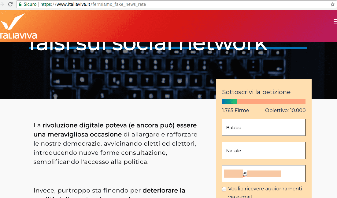 La raccolta firme del deputato di Italia Viva recita “basta fake”, ma si può firmare comodamente con dati falsi: non c’è conferma della registrazione (e non rispetta nemmeno il Gdpr)