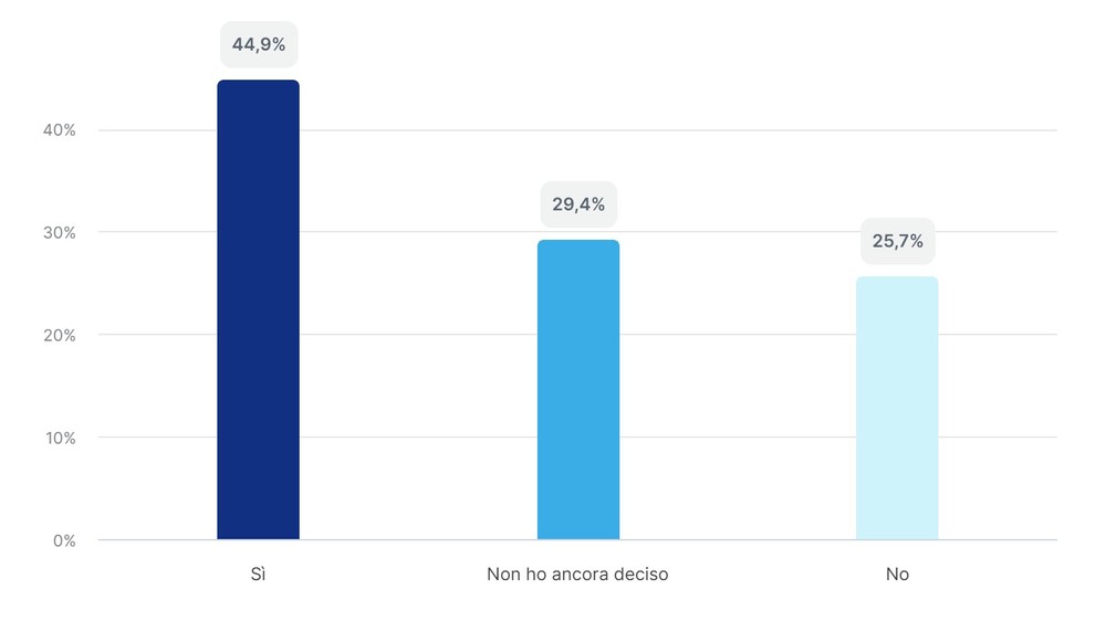 Interessante come quasi uno su due (il 44,9%) abbia effettivamente in mente di fare un acquisto mentre uno su tre circa (il 29,4%) è incerto e solo uno su quattro (il 25,7%) è deciso a non farlo.