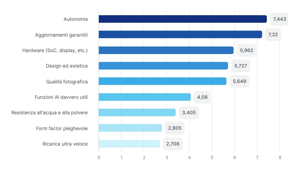 Autonomia e aggiornamenti garantiti hanno ottenuto i maggiori consensi, seguiti da tutto quello che riguarda l’hardware montato sotto al cofano e, quindi, le performance. Seguono design ed estetica, poi la qualità fotografica che resta uno degli aspetti su cui ancora anche i top di gamma, spesso con una dotazione simile, si distinguono l’uno dall’altro.