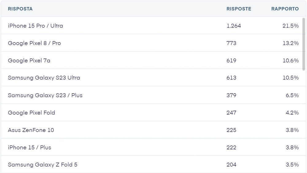 Forse più inatteso ma ugualmente interessante il risultato ottenuto da Google Pixel 8 e Pixel 8 Pro, ma anche dal “piccolino” Google Pixel 7a. Forte di un 2022 caratterizzato dal rilascio di smartphone di grande qualità, sembra che Google abbia guadagnato la vostra fiducia al punto da ottenere preferenze per quasi un voto su quattro. Non stupisce per l’ottimo lavoro fatto e l’eccellente rapporto qualità prezzo degli ultimi modelli, un po’ di più se si pensa che si tratta di prodotti sorretti da sforzi di marketing e distributivi tutto sommato limitati.