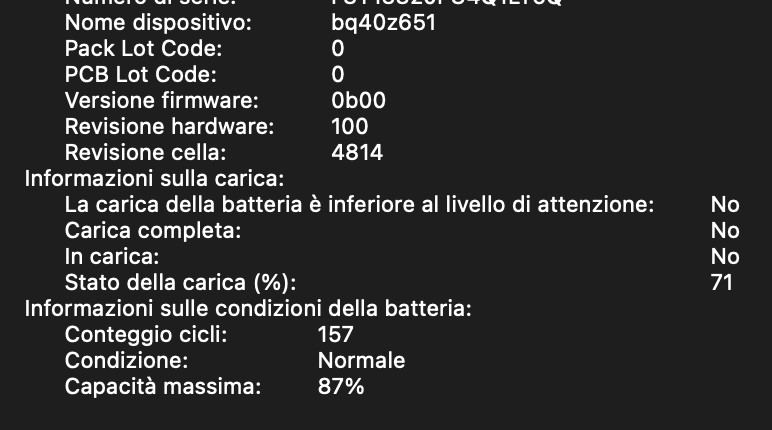 Ecco quindi che dopo 15 mesi la mia batteria è all’87% di salute con 157 cicli di ricarica, ovvero 13% perso che equivale a poco meno di un 1% al mese da novembre 2021.