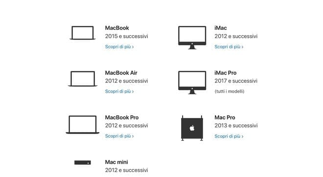 macOS 10.15 Catalina può essere installato su MacBook 2015 e successivi, MacBook Air 2012 e successivi, MacBook Pro 2012 e successivi, iMac 2012 e successivi, iMac Pro 2017 e successivi, Mac Pro 2013 e successivi e Mac mini 2012 e successivi.