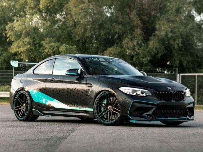 Esteticamente, la speciale BMW M2 Competition modificata si contraddistingue per dettagli come i cerchi Manhart Concave One in nero opaco, le misure degli pneumatici e componenti in carbonio come l’ala posteriore Clubsport, lo spoiler anteriore e una serie di adesivi neri con dettagli in verde menta.