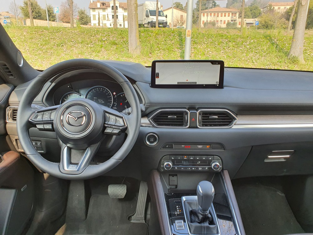 Buona la visuale davanti e tutto sommato anche dietro. Gli specchietti laterali sono ampi e permettono di avere una buona percezione dei lati del SUV. Mazda ha lavorato bene anche sull’insonorizzazione dell’abitacolo. Pochi pure i fruscii aerodinamici. L’auto in prova disponeva di un Head-up display che mostrava alcune informazioni di marcia e di navigazione. Per quanto questo accessorio non sia fondamentale, le immagini proiettate si leggevano bene e si trovavano perfettamente all’altezza della linea ottica.