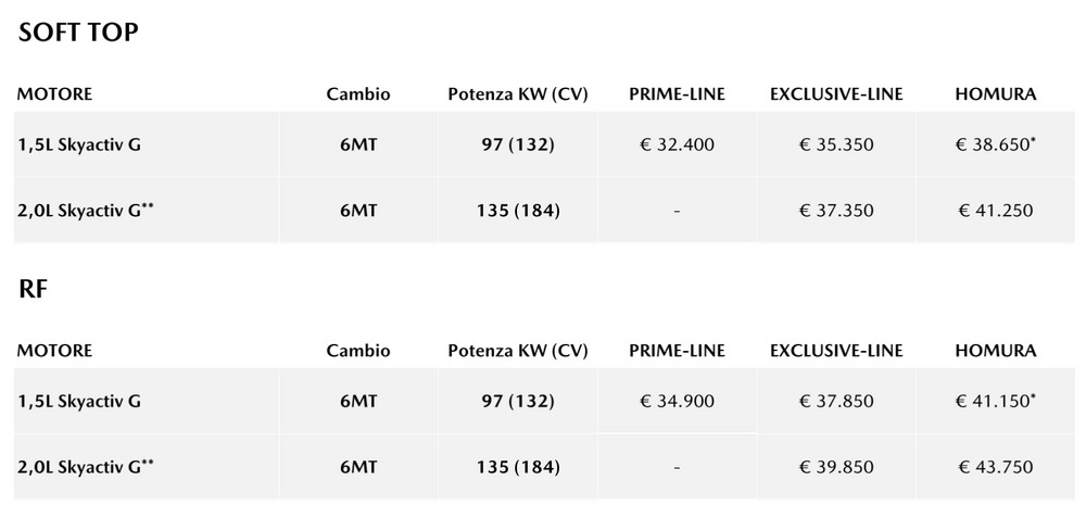 Il prezzo di partenza è di 32.400€ per la Prime-Line con 1.5 Skyactiv-G, mentre la 2.0 Skyactive-G da 184 cv, fino a quando non si esauriranno le scorte, parte dall’allestimento Exclusive-Line e costa 37.350€.