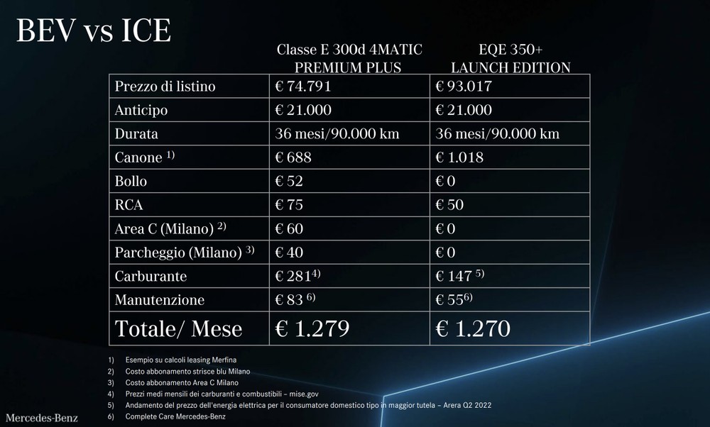 Con un anticipo di 21.000€ per entrambe, la Classe E diesel si porta a casa con un canone di 688€ per 36 mesi e 90.000 km, cifra che sale a 1.010€ per EQE. I vantaggi in termini di bollo, RCA, Area C, parcheggio, carburante e manutenzione, portano la simulazione di Mercedes ad un quasi pareggio: TCO di 1.279€ per Classe E diesel, 1.270€ per EQE elettrica.