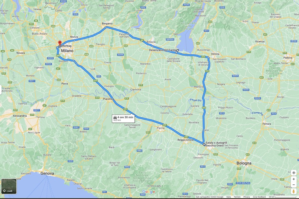 Protagonista della prova, EQE 350+ ha affrontato un percorso prettamente lavorativo: da Milano e Modena passando per una tappa simulata a Desenzano. Il traffico in uscita da Milano ha quindi lasciato spazio ad una giornata da più di 400 chilometri percorsi a bordo della berlina tedesca.