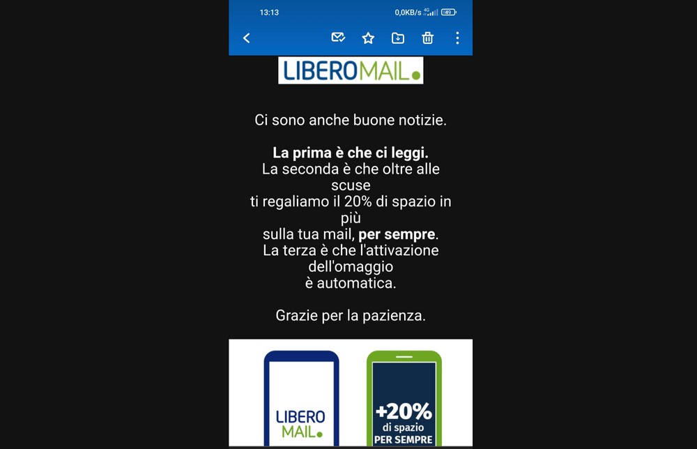 Panico che domenica ha avvolto anche TIM e i suoi clienti, con la rete che ha avuto un blackout di qualche ora a causa di un problema al “flusso dati su rete internazionale che ha generato un impatto anche in Italia”, ha poi spiegato l’operatore comunicando la fine dei disservizi. Sul fronte Libero e Virgilio Mail l’emergenza è ormai rientrata, e IoL, giusto ieri, ha iniziato a scrivere agli utenti danneggiati informandoli con un pizzico di autoironia sul risarcimento che aveva promesso: il ristoro è il 20% di spazio in più sulla mail per sempre. Pare un po’ poco a fronte della settimana abbondante di disagi, vedremo come la prenderà la community.