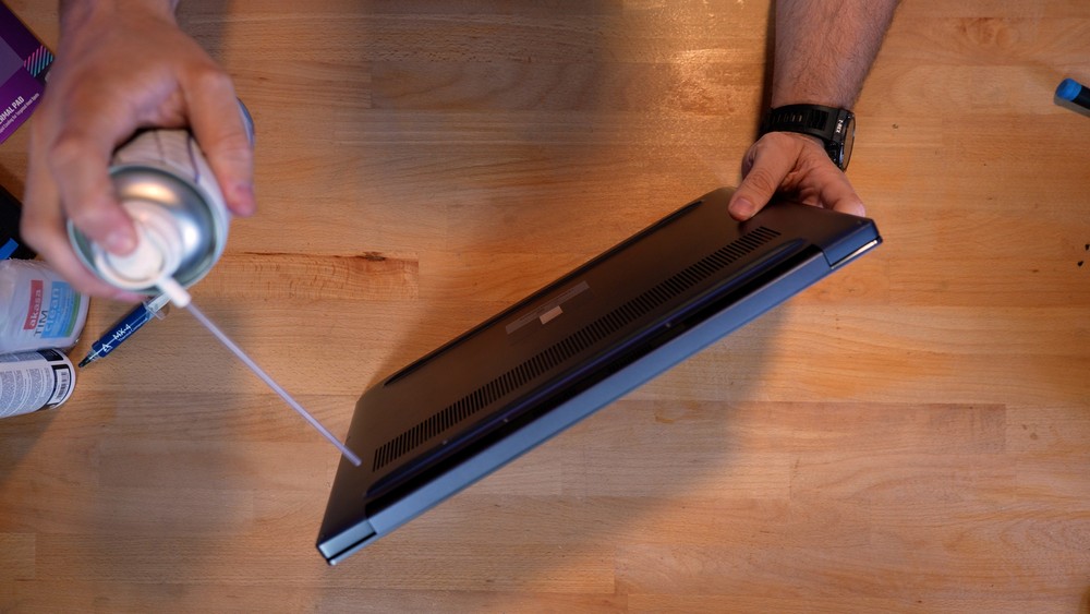 Questo processo è molto semplice e rapido; bastano davvero pochi secondi e uno sforzo quasi nullo. Vi basterà infatti prendere la vostra bomboletta di aria compressa e spruzzare un pò della stessa all’interno dello chassis tramite le feritoie che trovate sul fondo e sui lati del vostro notebook.