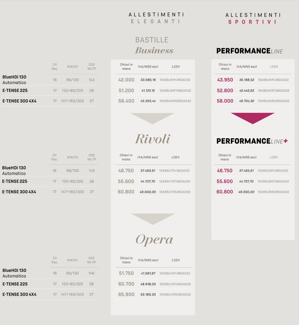 La versione ibrida plug-in E-TENSE 225 parte da 51.200€ e può accedere all’EcoBonus con tutti gli allestimenti tranne Opera, ma la proposta d’acquisto a rate prevede per entrambe 300€ al mese variando poi anticipo e rata finale, e con le eventuali differenze dovute dagli incentivi.