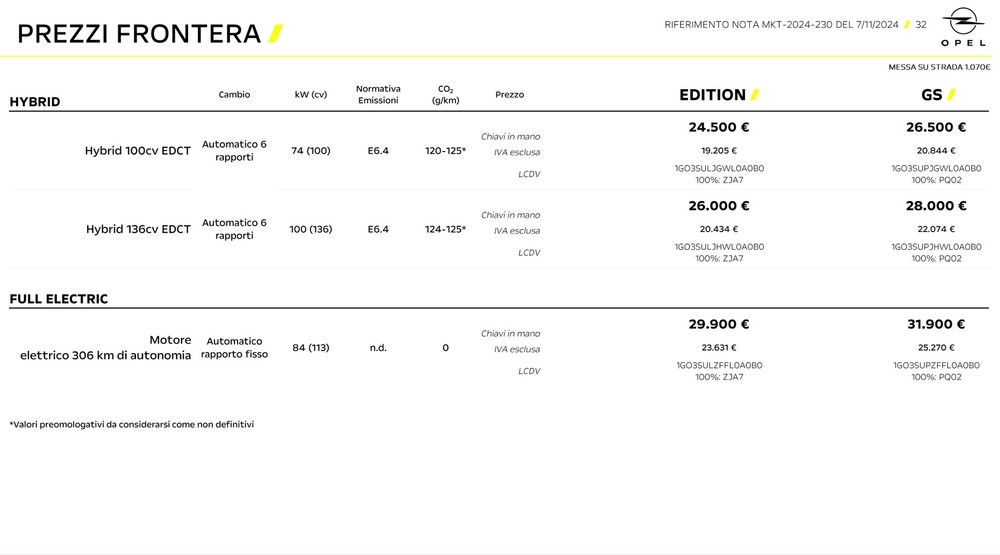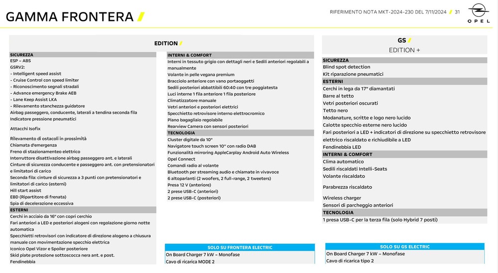 Opel Frontera Hybrid 100 cv, con cambio automatico a 6 rapporti di serie, costa 24.500€ nell’allestimento Edition che è già un livello “base” con una discreta dotazione, mentre arriva a 26.500€ nella versione GS che è la top di gamma e unica altra alternativa: non ci sono mille allestimenti e mille optional, e questo è un vantaggio nel semplificare la scelta.