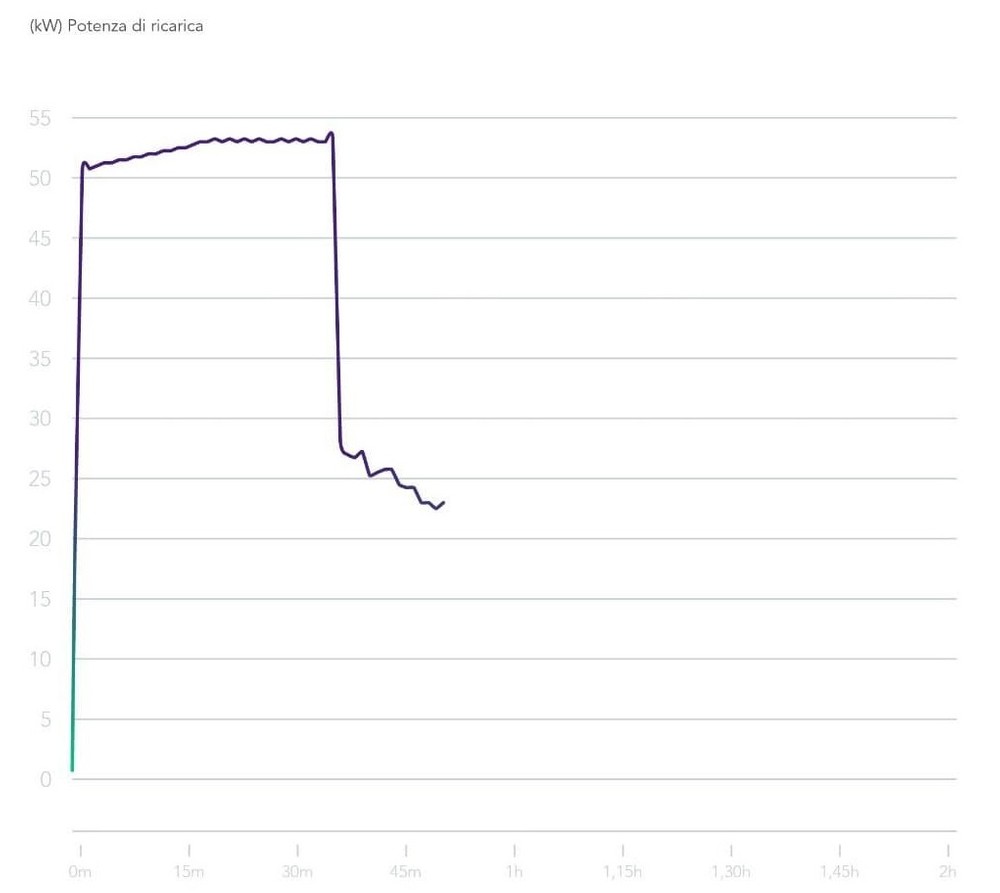 I gradini principali sono due, il primo si manifesta tra il 40% e il 50% con un calo verso i 50 kW che vengono poi mantenuti stabili fino alla parte in cui la batteria, per la chimica delle celle, è costretta a rallentare.