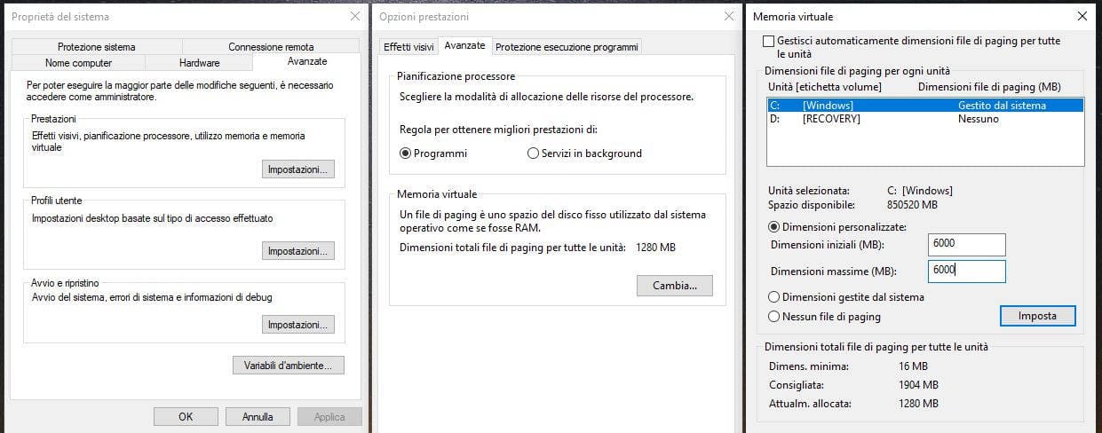 Per effettuare una configurazione del paging file di grandezza fissa, dovremmo impostare dimensioni iniziali e massime con lo stesso valore, con una dimensione in Megabyte che sia almeno pari a una volta e mezzo la dimensione della RAM fisica. Per esempio, su una macchina con 4 GB di RAM, la dimensione iniziale e massima del paging file dovrà essere di 6000 MB (4000MB x 1.5 = 6000 MB).
