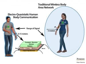 Gli scienziati della Purdue hanno messo a punto un sistema di comunicazione, che utilizza particolari circuiti elettrici, che richiede pochissima energia per funzionare e che permette di realizzare una body network completamente sicura: a fare da “punto di accesso” per i collegamenti da remoto (per esempio per acquisire i parametri misurati) è, in questo caso, lo smartphone della persona monitorata (smartphone che dovrebbe comunicare in modo sicuro, almeno lui, con l’esterno).