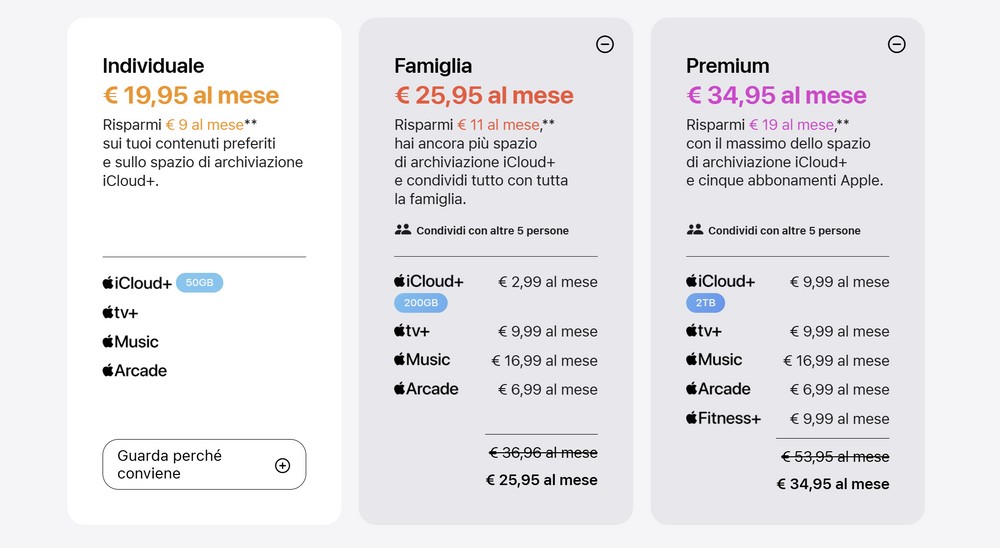Se avete familiari che utilizzano iPhone siete di fronte al migliore servizio di abbonamento dal rapporto qualità/prezzo. Apple One Family ha un costo di 25.95€ al mese. Nel mio caso, Apple One Premium, 34,95€. Entrambi gli abbonamenti sono condivisibili con 5 membri della vostra “Famiglia Apple”. Attenzione, non parliamo di cinque persone prese a casaccio ma cinque persone che dovete aggiungere al vostro nucleo familiare. Ci sono delle restrizioni particolari come la non possibilità di cambiare frequentemente nucleo familiare, per evitare che questa funzione venga abusata.
